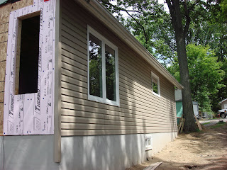 The porch is going up by leaps and bounds! The roof was put on Friday and today they got the windows and door cut out and installed. They added the Typar and now we're just waiting for the inspection - hopefully tomorrow. It looks totally different from the old porch - it's going to take some "getting used to". I don't imagine it'll take long once we have a few chilly days this fall when we can still use it.